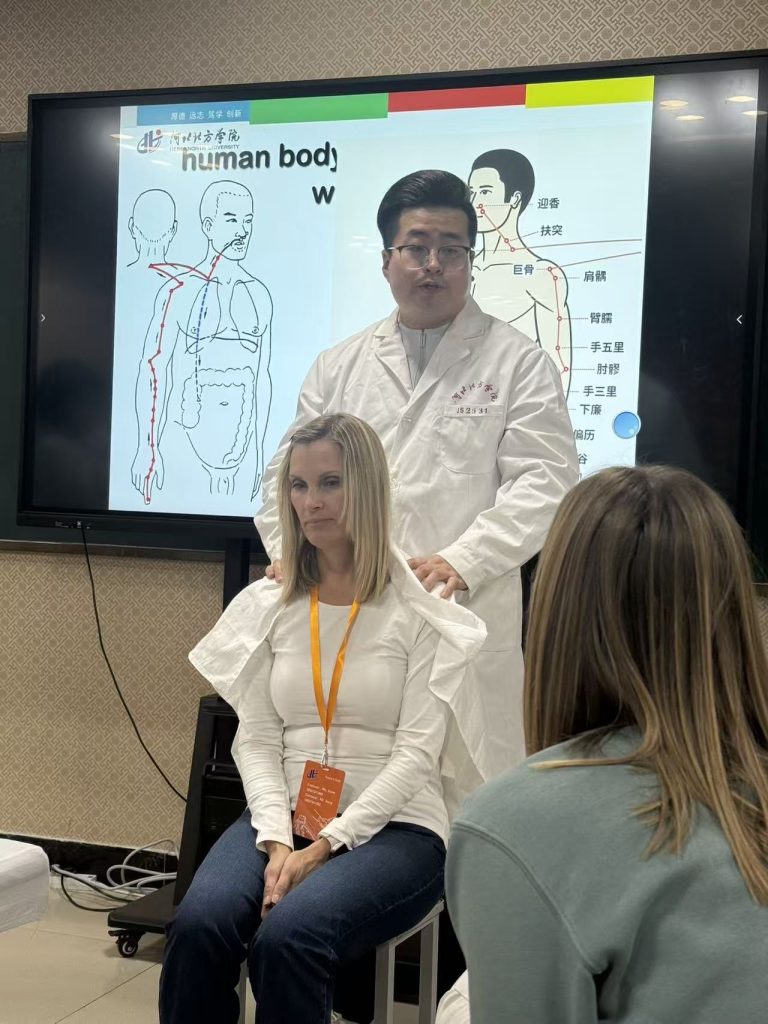 On the last day of the tour, students dove deep into Traditional Chinese Medicine with several classes hosted by Hebei North University. They were introduced to the herbs and medicines and visited acupuncture and massage facilities on campus. They then changed into Tai Chi outfits for their Wushu and Tai Chi lessons. Martial arts improves the human body’s health and vitality. In the afternoon, the students visited the School of Foreign Languages to interact with more students.