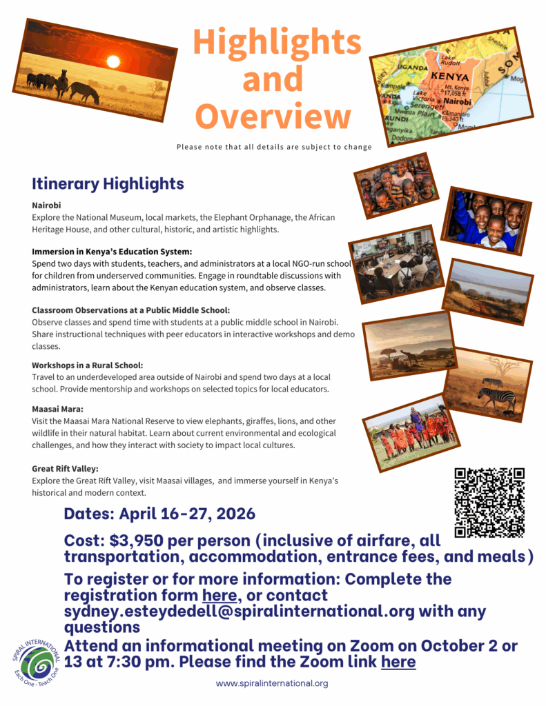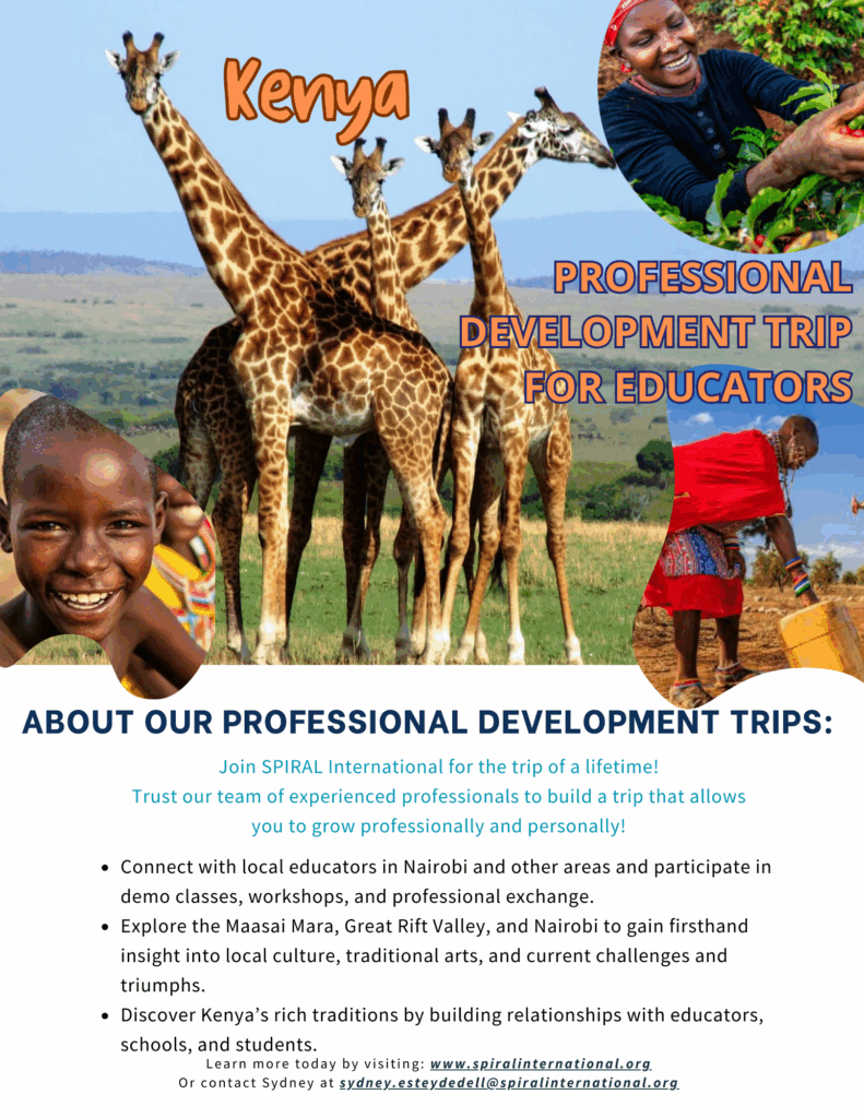 Next April, join SPIRAL International and its partners in Kenya for an 11-day professional development trip for educators in Nairobi and surrounding areas! Educators will have the opportunity to visit multiple local schools, engaging in dialogue, observing classrooms, and conducting workshops for local teachers. They will also gain a first-hand perspective on the history, culture, and current challenges facing Kenya by visiting museums, tribal villages, and the Maasai Mara National Reserve.